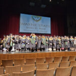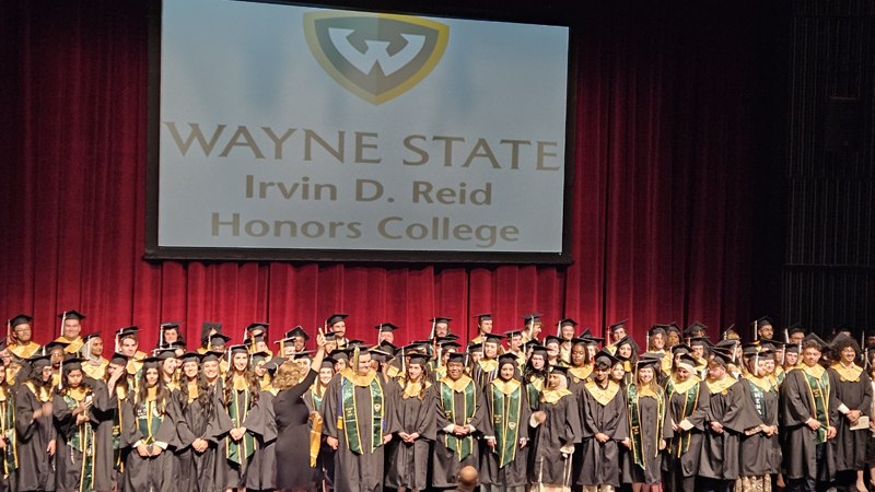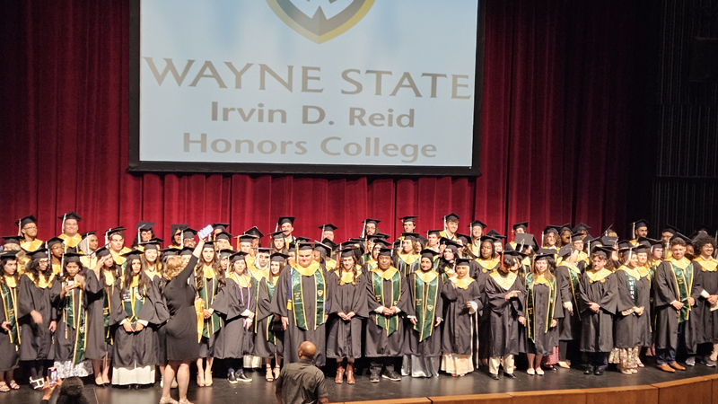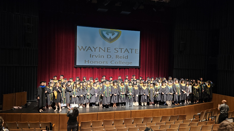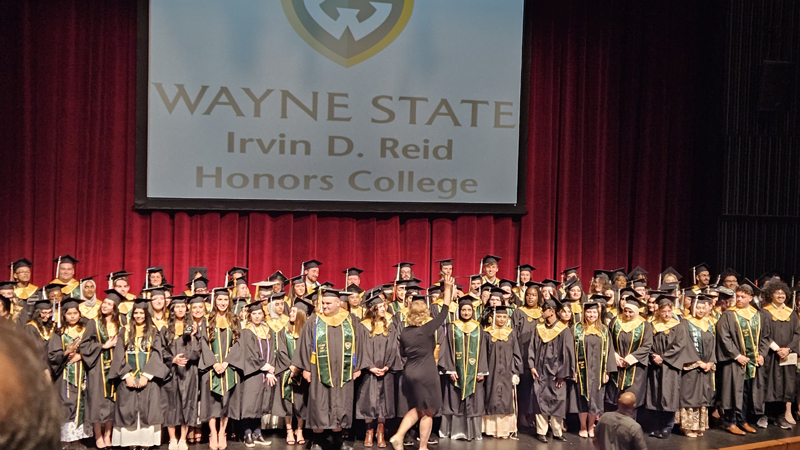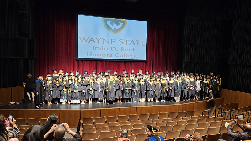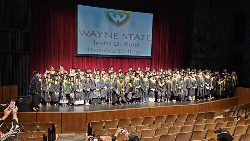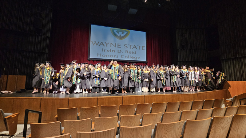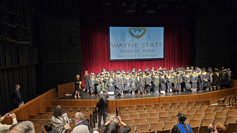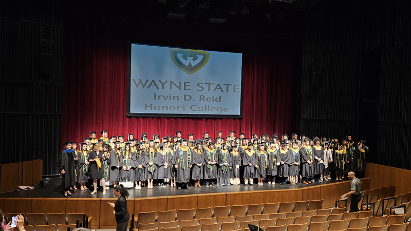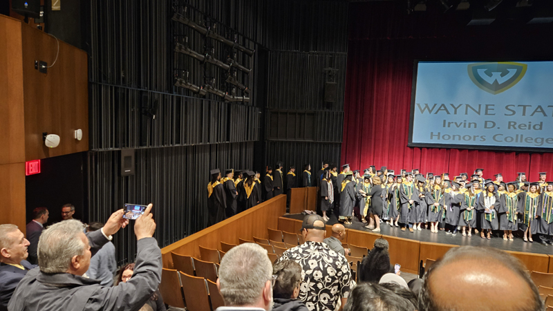 James had 3 graduations in 2 days. The first was the Honors Graduation which took place a day before the other two. The idea is that the honor students would receive their awards and banners so that they could wear them the next day at their other graduations. This graduation was done in a theater on the Wayne State Campus and was very well done and the speakers were very good and not too long winded. James and the other honor grads stuck around after the ceremony to take some group pictures, Hopefully they turn out ok, but just in case we thought that we would take some too.